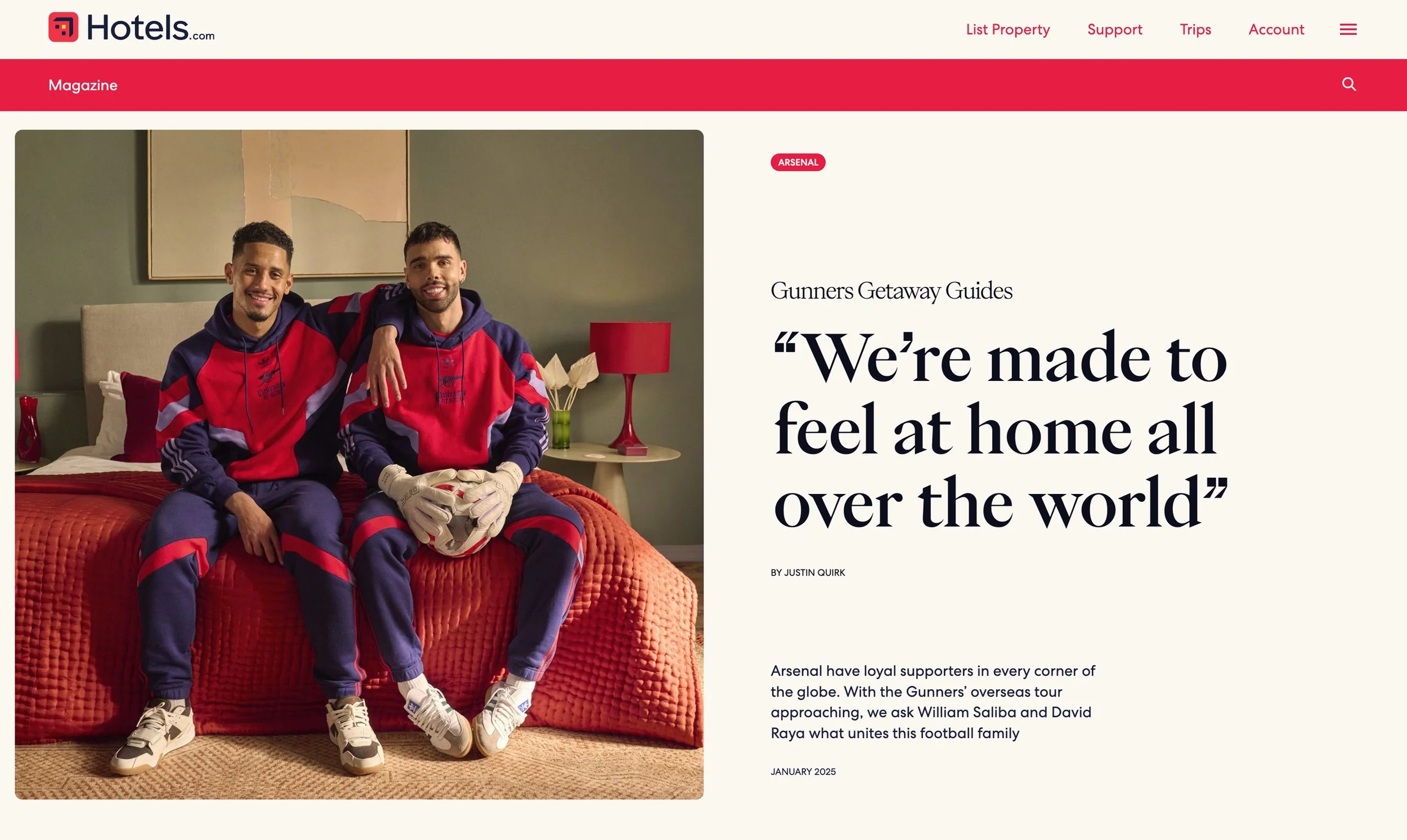 “A Room for Everyone” was a season-long Hotels.com partnership with Arsenal FC celebrating football’s diverse global community and boosting brand relevance. We created a metaphorical “Arsenal Hotel,” a welcoming space for all, brought to life through a 360° campaign featuring influential fans, players, and legends. A central hub let supporters book stays, enter competitions, and explore exclusive packages.