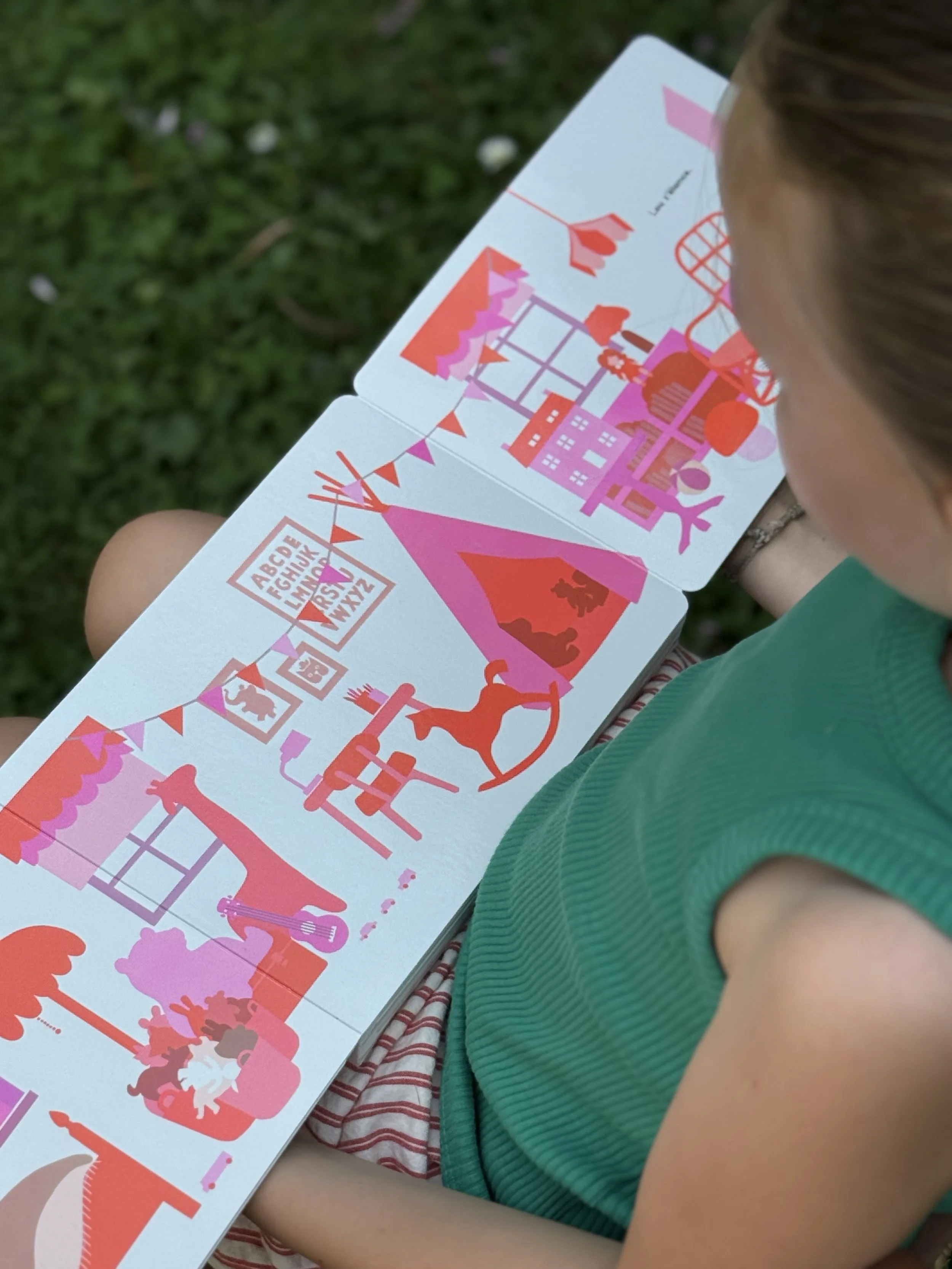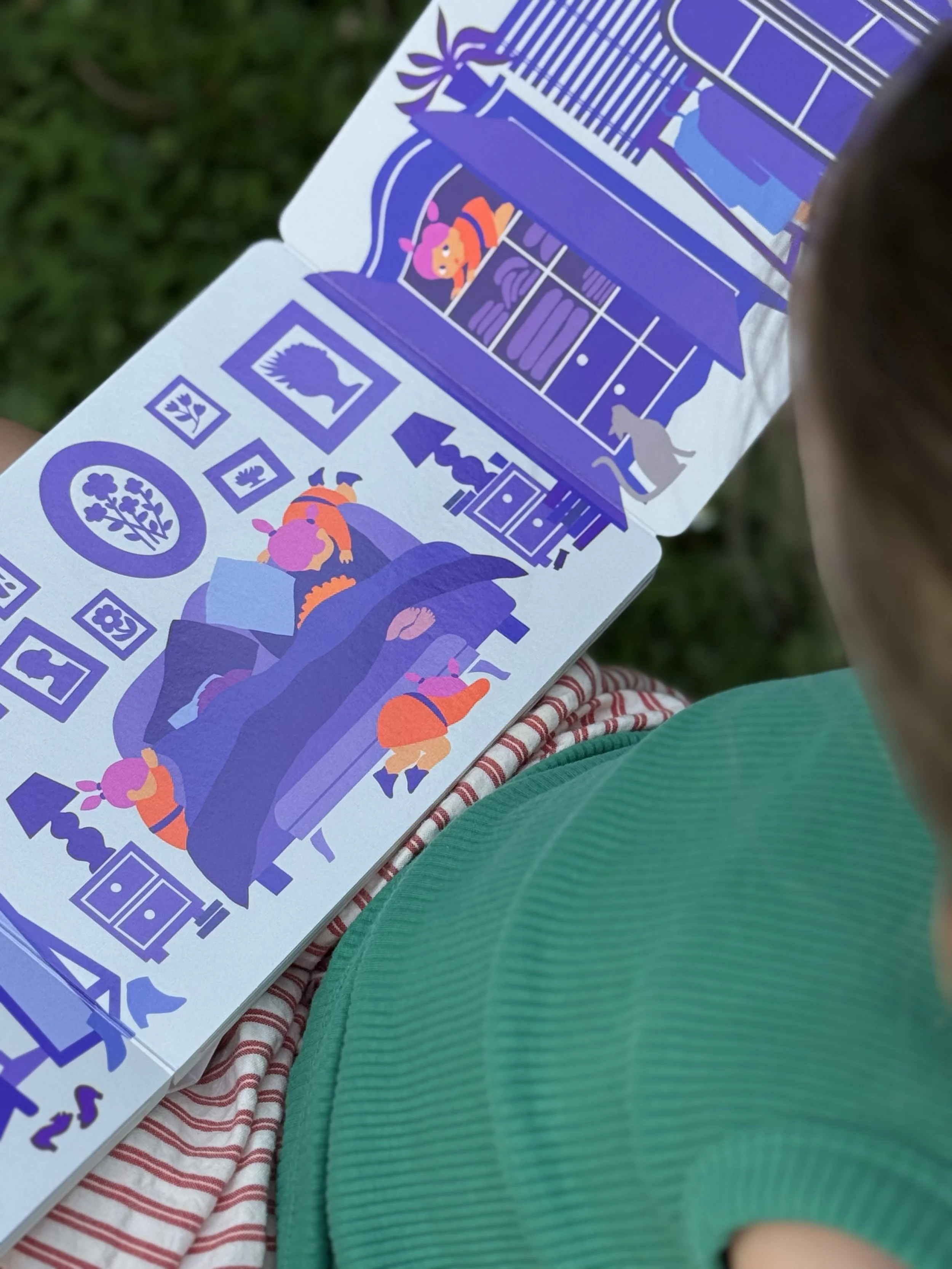 A playful hide-and-seek story, where each spread is a different room of the house and opens up as a super panoramic image, with its own colour palette.